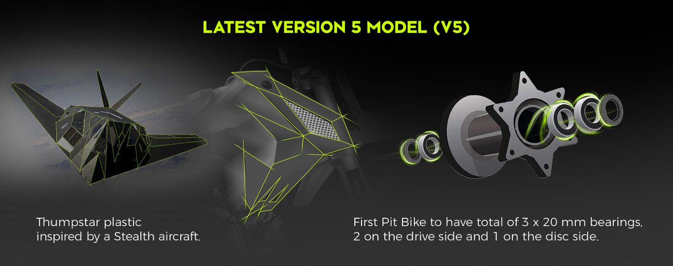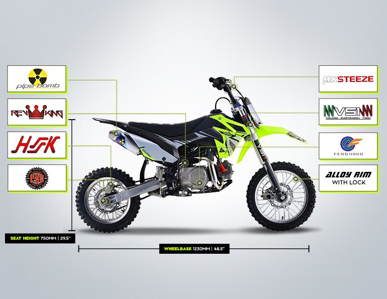 We've done an overhaul on a few of our bikes with the new line-up, and the TSB 110 wasn't left out. The new TSB 110 is gearing up in style with all the looks of the bigger motocross bikes but designed for kids, beginner riders, and we all know experienced adults also love riding this model. TSB 110 has a seat height of 710mm and 4-speed semi-automatic gearbox, which are similar specifications to its competitors (TTR110, CRF110, KLX110, DRZ110). Your little ones will feel all laughter and smiles. Highlighted with special features including Chartreuse Plastics, Stripe Gripper Seat, and AK-7 Alloy Rim this bike allows your teens to have fun and enjoy their new motorcycle. Although it has a kick start, it is still very easy to start. So, kick it over and surf the dirt away. (2016 TSK 110 is electric and kick start.) The TSB 110 has received a complete overhaul for Version 5. Gone are the days of facing struggles of dealing with issues that are common on many other mini bikes. We have gone back to the drawing board and scratch built a New Frame, Airbox, Linkage Suspension, Hubs and Rims, and much more. This has not only allowed our bikes to become stronger and more reliable, but also gives the rider peace of mind knowing, no detail has been left untouched. Our design team has produced a piece of engineering art. The frames are a new Quad Bar which has made them stronger than ever. Along with the frame developments we made space and rigged them with mounts to accommodate our new caged airboxes. This allows a better air filtration system while increasing airflow into the carburetor and, in turn, more horsepower. A first on pit bikes and minibikes alike, we have scaled down the linkage from the likes of a full-size race bike and fitted it to these smaller sized 110s. The linkage provides a much smoother ride than traditional PDS style suspension, which allows for faster cornering, high and low speed adjustments, and increased rider comfort. We have redesigned our hubs and created space for a much heavier duty 20mm rear axle, coupled with stainless spokes and alloy rims, which provide our strongest wheels to date. Check out our description video and the following spec lists to see these upgrades!
